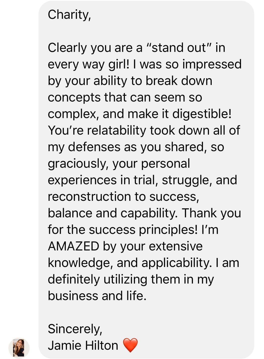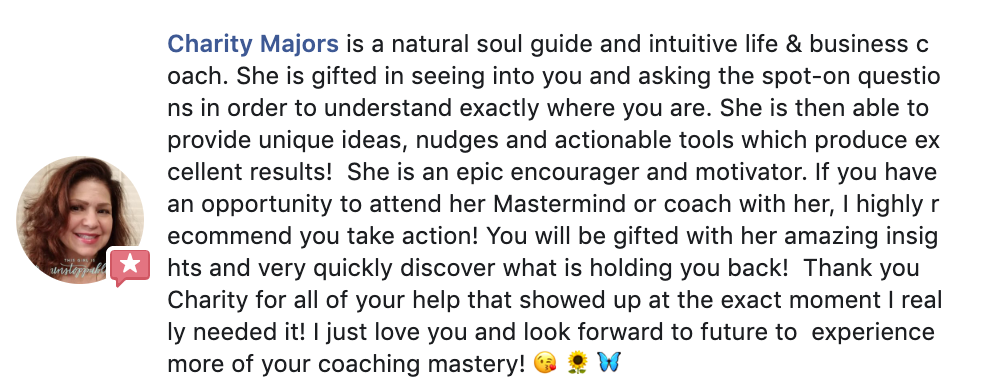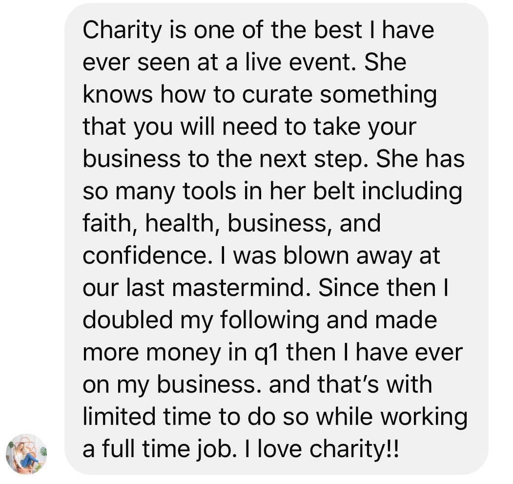 Charity is an author, international speaker, a soulful mindset coach and a savvy digital marketing strategist, that has coached over 1000 women, all around the world, to bust through their fear, grow their confidence, and align with their purpose so they can grow their income, increase their influence and make a major impact.